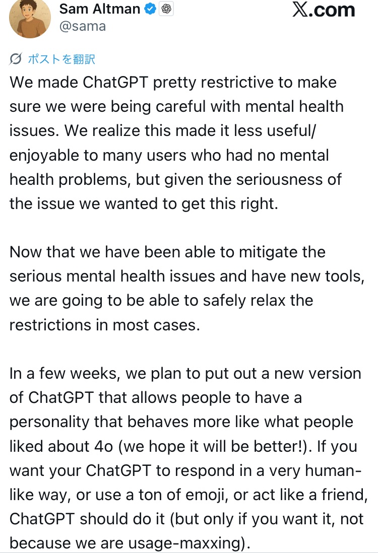 アルトマン氏は投稿の中で、「ChatGPTをかなり制限的にしたのは、メンタルヘルスの問題に慎重に対処するためだった」と説明。その結果、精神的な問題を抱えていない一般ユーザーにとっては、「使い勝手や楽しさが失われてしまった」と認めた。